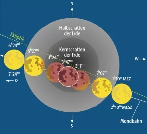 Von einer partiellen oder teilweisen Finsternis spricht man, wenn nur ein Teil der Mondscheibe in den Kernschatten der Erde gerät. Tritt der Mond jedoch vollständig in den Kernschatten ein, so ist die Finsternis total. Eine totale Mondfinsternis nimmt folgenden Verlauf: Der Mond wandert von West nach Ost durch die Sternbilder des Tierkreises (nicht zu verwechseln mit der täglichen Himmelsdrehung, die von Ost nach West erfolgt!). Dabei schiebt er sich von Westen her kommend durch den Erdschatten. Zunächst tritt er in den Halbschatten ein, der „1. Kontakt“ findet statt – ein Vorgang, der unbeobachtbar bleibt.