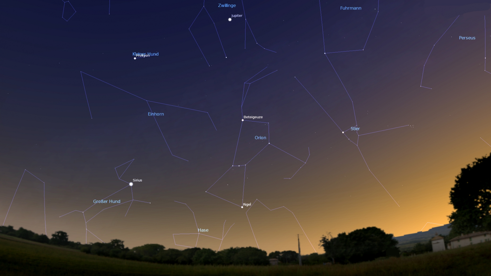 Unter den Sternbildern dominieren jetzt die beiden bekannten Konstellationen Großer Wagen und Löwe. Beide stehen relativ hoch am Himmel, der Löwe ein wenig nach Südosten verschoben, der Große Wagen östlich davon. Auffallend im Löwen ist vor allem sei hellster Stern, Regulus. Er markiert das untere Ende der Brust des liegenden Löwen. Regulus ist fünfmal größer als unsere Sonne und leuchtet nicht gelblich, sondern weißlich-blau.