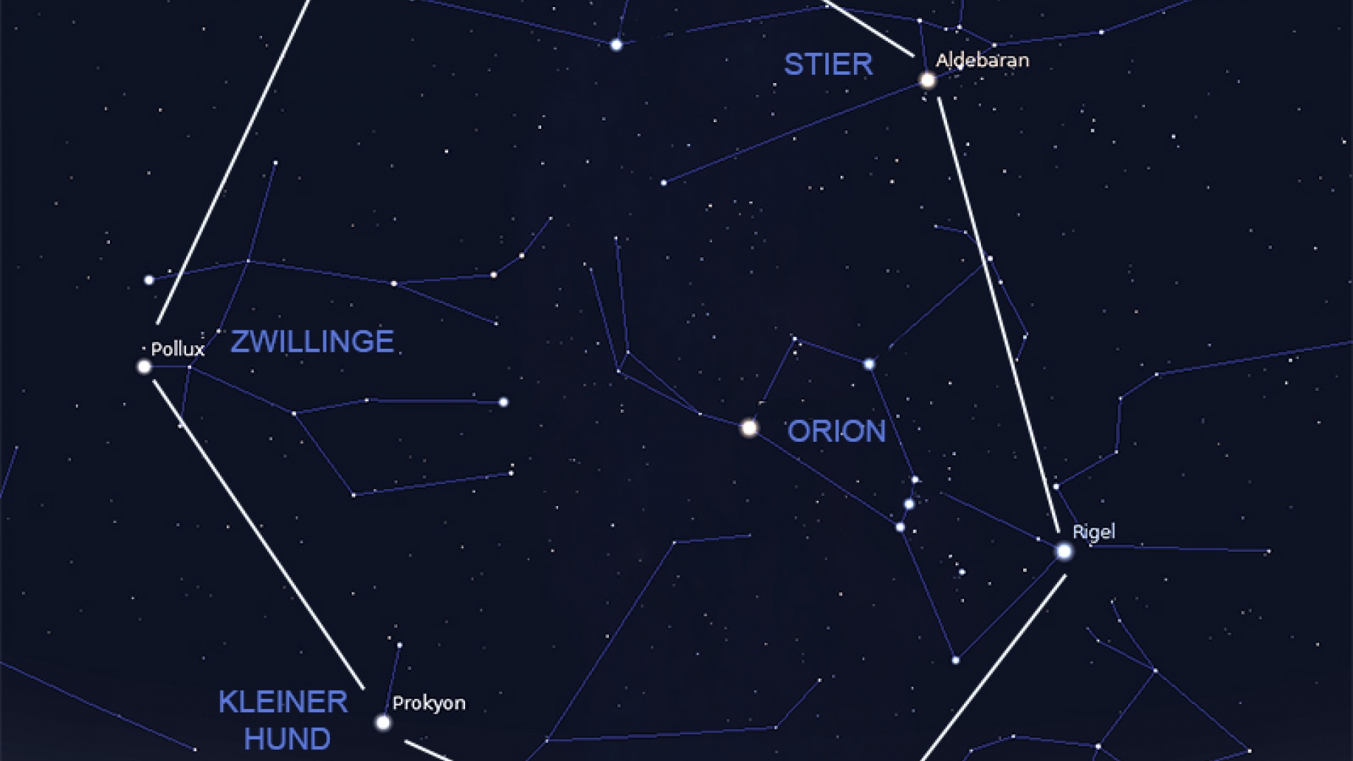 Ähnlich wie das Sommerdreieck und das Herbstviereck gibt es auch im Winter eine Gruppe von hellen Sternen, die diese Jahreszeit am Himmel markiert. Das Wintersechseck ist im November in der zweiten Nachthälfte sichtbar, ab Januar dann schon ab 22:00 Uhr abends. Es wird aus den hellsten Sternen von sechs Sternbilder gebildet: der Capella im Fuhrmann, dem Rigel im Orion, dem Aldebaran im Stier, dem Pollux in den Zwillingen, dem Sirius im Großen und dem Prokyon im Kleinen Hund.