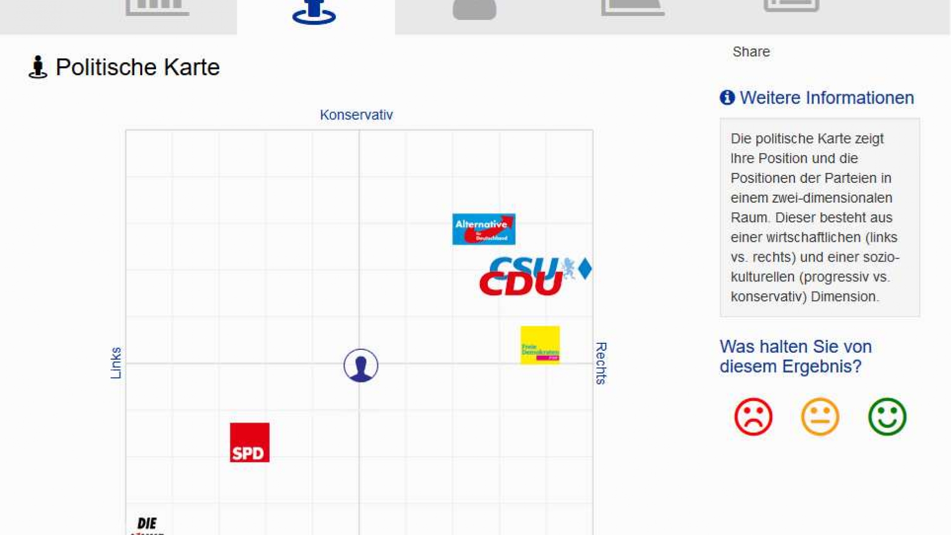 Verglichen werden dabei folgende Parteien: CDU, CSU, SPD, Linke, Grüne, FDP und AfD. Das Ergebnis des Vergleichs zwischen Wähler- und Parteipositionen wird in mehreren Formen dargestellt, zum Beispiel als Einordnung auf einer "politischen Landkarte".
