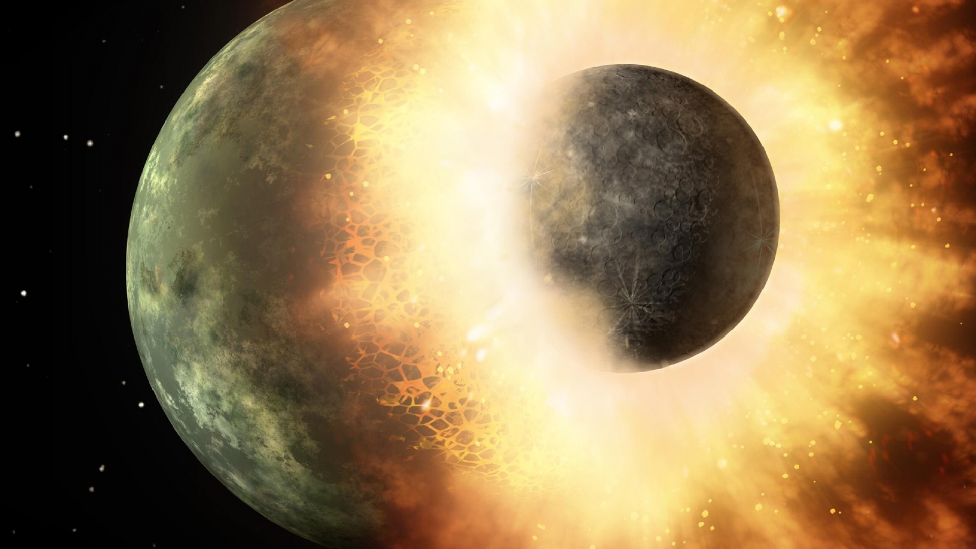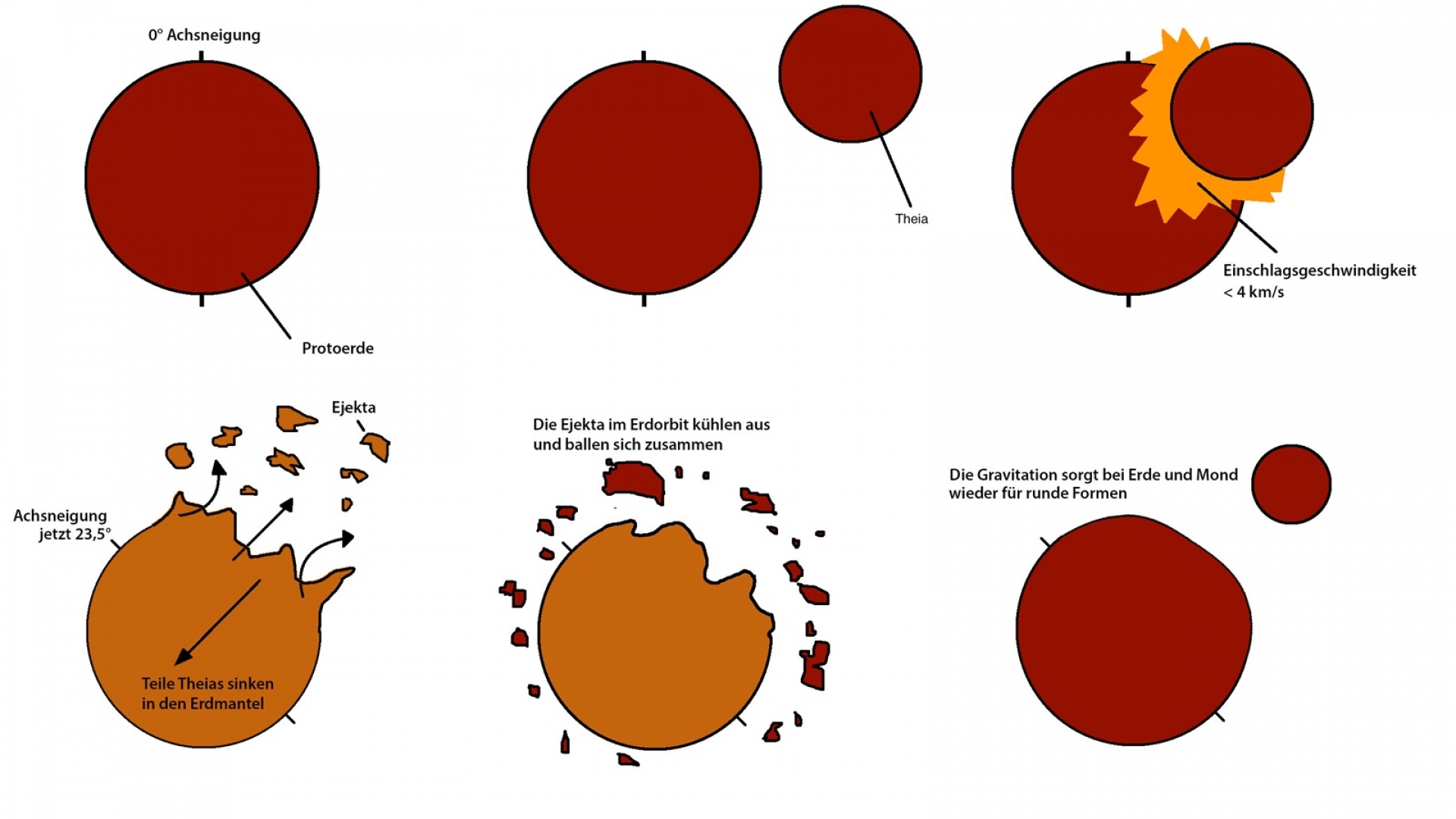 Seit etwa vierzig Jahren gilt aber die sogenannte Kollisionstheorie als beste Erklärung für die Entstehung des Mondes. In diesem Szenario kollidierte die junge Erde vor etwa 4,5 Milliarden Jahren mit einem marsgroßen Protoplaneten, der Theia getauft wurde. Der Name verweist auf die Titanin Theia, die in griechischen Mythologie die Mutter der Mondgöttin Selene ist.