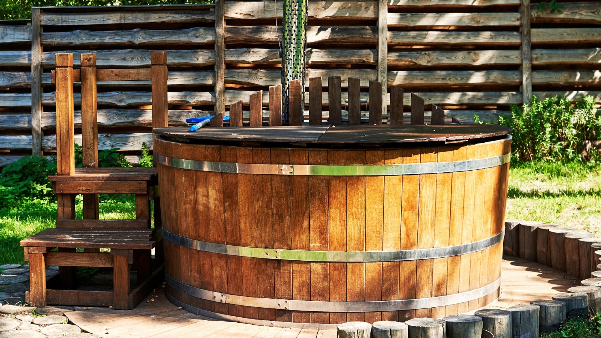 Durch eine Holzverkleidung kann sich das Badefass gut in die natürliche Umgebung einfügen. Die Verkleidung des Fasses sollte aus einem beständigen, wetterfesten Holz bestehen, dann kann das Fass das gesamte Jahr über genutzt und draußen stehen gelassen werden. Praktisch ist es zudem, wenn das Holz zum Anfeuern direkt in der Nähe gelagert wird.
