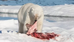Dieser Eisbär hat gerade eine Bartrobbe erlegt und beginnt, sie auszuweiden.