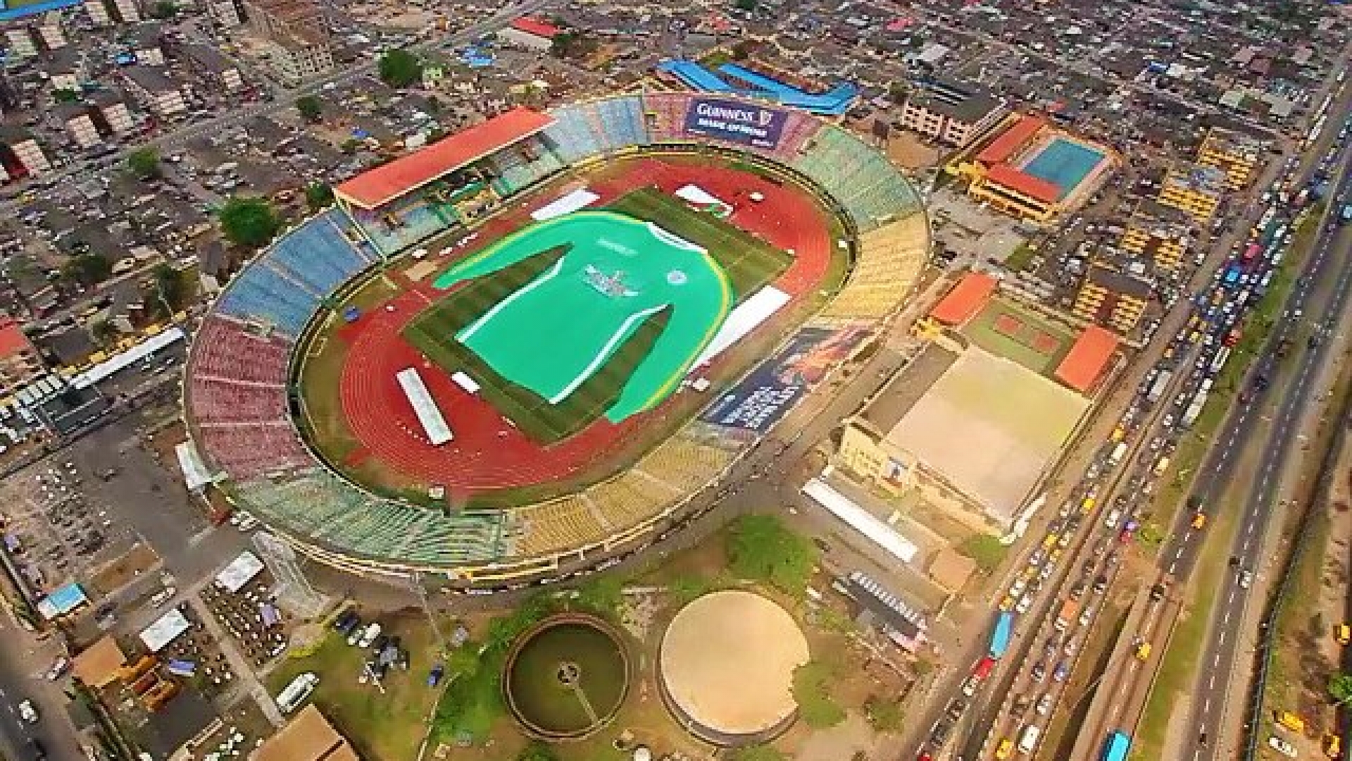 Blick auf das im Teslim Balogun Stadium von Lagos ausgebreitete größte Fußballtrikot der Welt.