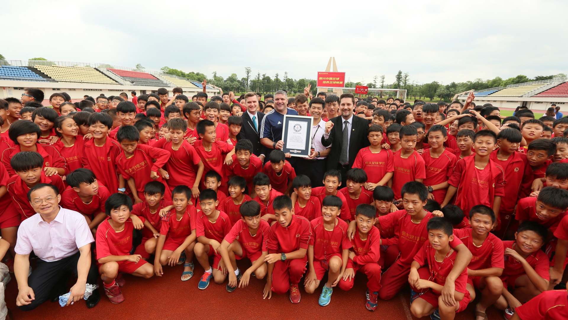 Im Juni 2015 studierten sagenhafte 2.577 Schüler an der Fußballschule Evergrande in Qingyuan, China - Weltrekord.