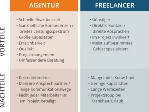 Wer eine Webseite neu erstellen lassen will oder ein Relaunch bzw. Redesign plant, steht vor der Auswahl zwischen einer Agentur oder einem Freelancer. Beide Seiten bieten Vor- und Nachteile. Die Wahl sollte von der Größe des Projektes und dem vorhandenen Budget abhängig gemacht werden. In der nachfolgenden Grafik sind die wichtigsten Argumente für die Vor- und Nachteile untergebracht.