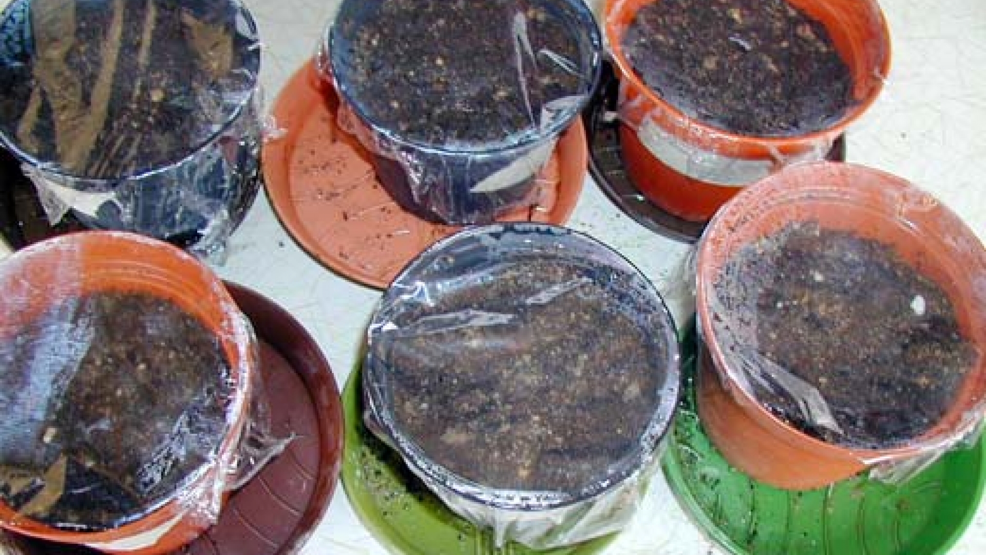 Mische dann in einem Eimer Sand mit Blumenerde. Gib die Mischung in kleine Blumentöpfe oder in die Schale eines Blumenhauses und streiche sie glatt. Gib ungefähr fünf Samen in jeden Topf und bedecke sie mit einem Zentimeter Erde.