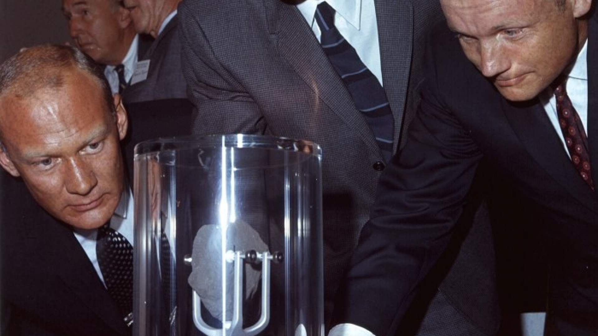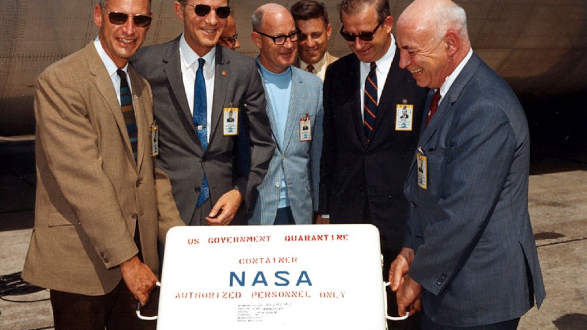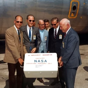 Juli 1969 - Mehr als 50 Universitäten und Laboratorien in aller Welt beteiligen sich an der Untersuchung der ca. 21 kg Mondgestein, die die "Apollo-11"-Astronauten vom Mond mitgebracht haben. Die Eigenschaften des Gesteins werden unter allen möglichen wissenschaftlichen Gesichtspunkten analysiert. Um jegliche Erdeinflüsse auszuschalten, werden die Gesteinsproben in Vakuumkästen verwahrt, in denen "Weltraumatmosphäre" mit einem Luftdruck von nur einem Millionstel Torr herrscht.