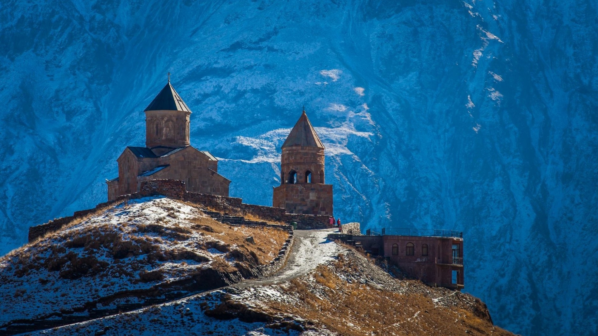 Auch die Kasbegi-Region lockt im östlichen Teil des Hochgebirges mit Alpenpanoramen und vielen 4.000-ern. Die Stadt Stepanzminda dient als Ausgangspunkt für die Besteigung des 5.047 Meter hohen Kasbek. Wer sich nicht über die verschneiten Hänge des Berges schleppen möchte, kann sich auch einfach vor der Dreifaltigkeitskirche Gergetis Sameba mit dem Kasbek im Hintergrund ablichten lassen – ein beliebtes Fotomotiv.