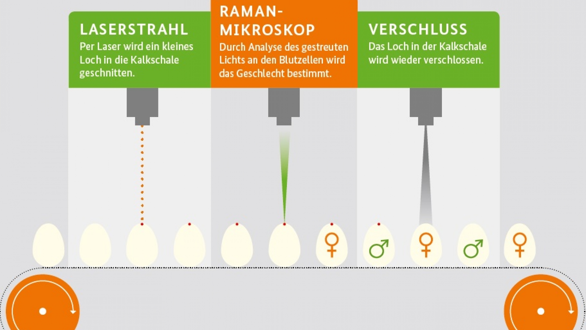 Das Prinzip hinter der Idee klingt einfach: Wenn man schon lange vor dem Schlüpfen das Geschlecht der Küken bestimmen könnte, müssten Eier mit männlichen Embryos gar nicht erst ausgebrütet werden. Stattdessen könnten sie frühzeitig aussortiert und von der Industrie, zum Beispiel in der Futtermittelherstellung, weiter verwertet werden. Millionenfaches Kükenschreddern fiele auf diese Weise weg.