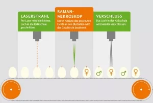 Um sie zu erkennen, bestrahlen die Forscher die Eier mit Licht aus dem nahinfraroten Bereich. Durch die Analyse des an den Blutzellen gestreuten Lichts mit einem Spezial-Mikroskop können sie dann erkennen, ob ein kleineres oder ein größeres Geschlechtschromosom vorhanden ist. So können sie das Geschlecht bestimmen. Für diese Analyse muss lediglich mit einem Laser ein winziges Loch in die Eierschale geschnitten werden, das anschließend wieder verschlossen wird.