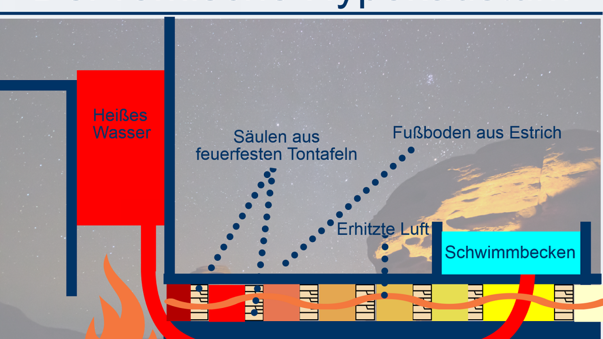 Im antiken Rom wurde die Idee der „Heizung von unten“ dann auf die Spitze getrieben und gleichzeitig verbessert: Bei der Kanalheizung wurde das Hypokaustum-Prinzip aufgegriffen und verbessert, diente aber gleichsam als „früher Badeofen“, um Wasser zu erhitzen.