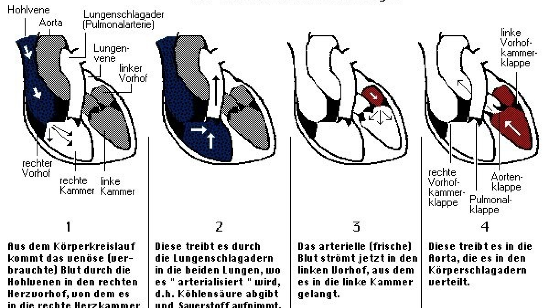 Bei Wirbeltieren wird das Herz mehr und mehr zu einem in den Blutkreislauf integrierten kompliziert aufgebauten Pumporgan. Es findet sich in seiner einfachsten Form bei den Fischen und besteht hier nur aus einem Vorhof (Atrium) und einer Herzkammer (Ventrikel). Es nimmt sauerstoffarmes Blut aus dem Körper auf und leitet es weiter zu den Kiemen, wo der Gasaustausch stattfindet. Mit dem Übergang zum Landleben und der damit verbundenen Lungenatmung kommt es bei Amphibien, Reptilien, Vögeln und Säugetieren zu einem Umbau von Herz und Kreislauf. Es kommt zur Ausbildung eines doppelten Blutkreislaufs und zu einer fortschreitenden Aufteilung des Herzens: Das Herz hat zwei Vorhöfe; in den rechten münden die Körpervenen, die sauerstoffarmes (venöses) Blut führen, in den linken die Lungenvenen, die von der Lunge her sauerstoffreiches (arterielles) Blut führen. Bei den Amphibien ist die Herzkammer noch ungeteilt, so dass sich das arterielle und das venöse Blut mischen. Bei Reptilien sind bereits zwei Herzkammern durch eine unvollständige Trennwand geteilt, so dass nur noch eine teilweise Mischung des Blutes stattfinden kann. Bei Vögeln und Säugern sind die beiden Herzkammern vollständig getrennt. Jede Herzkammer steht mit ihrem Vorhof durch Ventile (Segelklappen) in Verbindung, die einen Rückfluss des Blutes verhindern. Von der linken Herzkammer geht die große Körperschlagader (Aorta) aus, von der alle Körperschlagadern (Arterien) abzweigen; aus der rechten Herzkammer entspringt die zur Lunge führende Lungenschlagader (Lungenarterie). Auch hier sind wiederum Ventile in Form von Taschenklappen zwischengeschaltet.