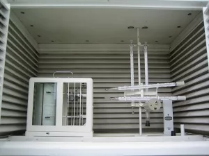 Ebenfalls genau geregelt ist, wie die Temperatur an den Wetterstationen gemessen wird. Dabei gilt: Grundsätzlich erfolgt die Messung der Lufttemperatur in zwei Metern Höhe durch mindestens zwei parallel arbeitende Temperaturfühler. Diese Fühler stecken in einem speziellen Gehäuse oder einer Schutzhütte mit Lamellen. Dadurch sind sie nicht der direkten Sonneneinstrahlung ausgesetzt und auch Insekten können sich nicht so leicht auf den Sensoren niederlassen. Gleichzeitig kann die Luft gleichmäßig ein- und ausströmen.