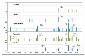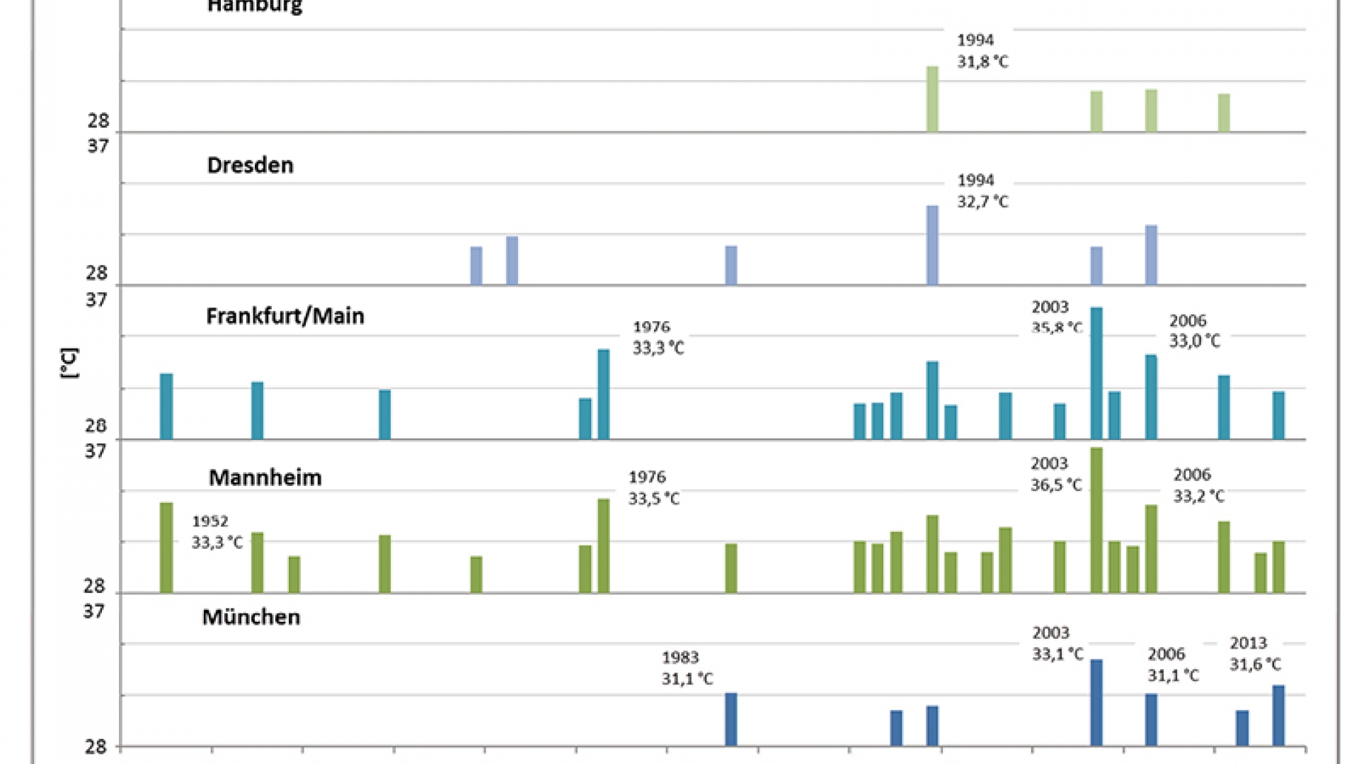 Diese immer stärkere Häufung von Hitzewellen bestätigt der DWD auch für Deutschland: So gab es in Hamburg vor 1994 noch gar keine zweiwöchigen Hitzeperioden mit mindesten 30 Grad Tagestemperatur, danach aber bereits vier Mal. Frankfurt am Main erlebte seit 1990 zwölf solcher Hitzewellen, Mannheim sogar 15. Sollte die aktuelle Hitzewelle tatsächlich wie vorhergesagt bis Mitte Juli anhalten, wird sie sich in diese Reihe einordnen.