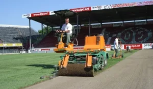 Will man ihn länger am Leben lassen, wird der Rasen vertikutiert oder auch aerifiziert, das heißt mit kleinen Löchern gespickt. Das dient dazu, dass mehr Luft und Sauerstoff an die Wurzeln kommt, was das Pflanzenwachstum aktiviert. Anschließend werden die kleinen Löcher mit Sand befüllt, damit sie nicht so schnell zuwachsen und die Sauerstoffversorgung länger besser funktioniert. Fußballrasen ist aber so schnell verbraucht, dass er häufig ausgetauscht wird.