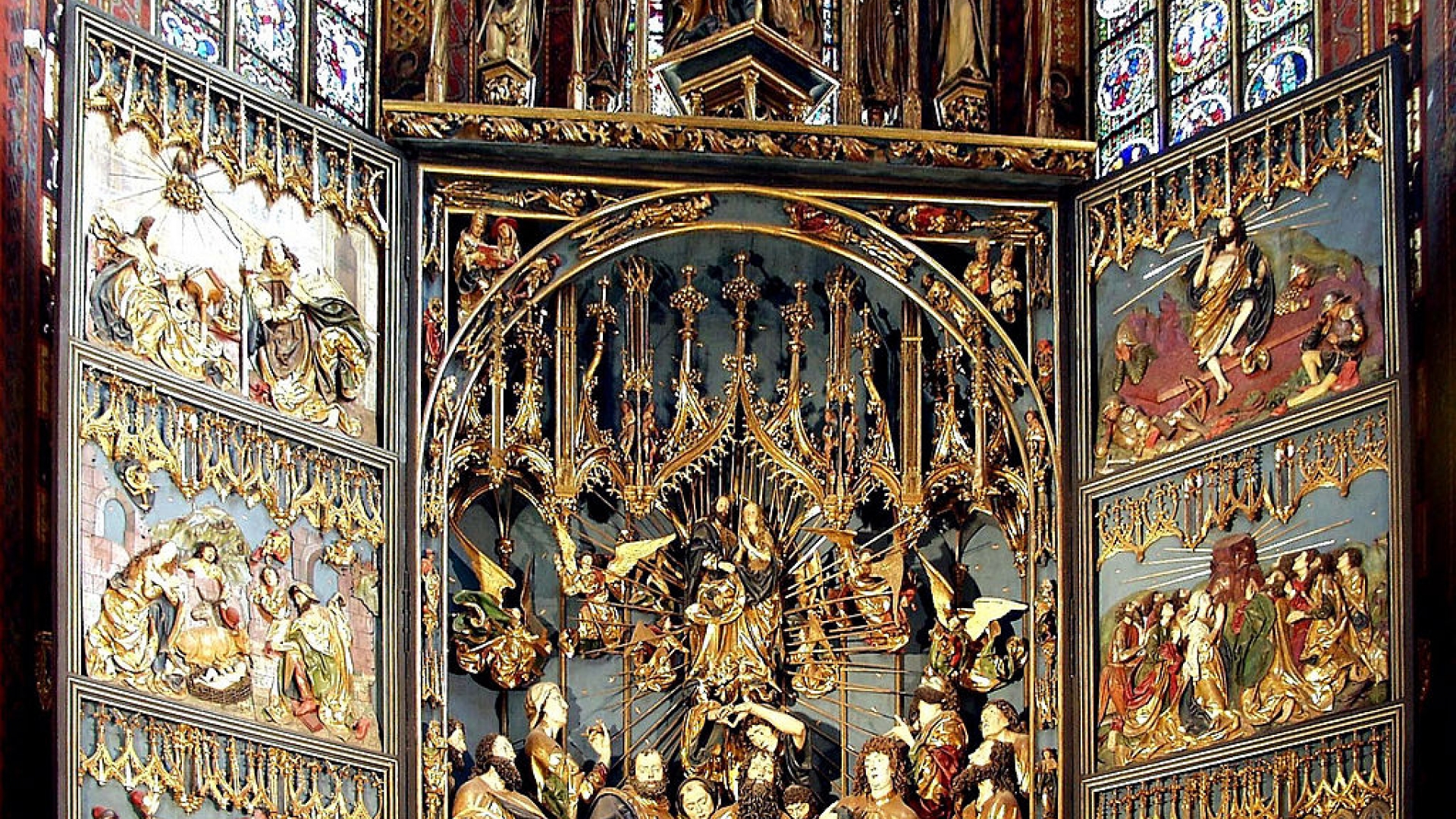 Mit einer Höhe von dreizehn und einer Breite von elf Metern ist der berühmte Hauptaltar der Marienkirche der größte erhaltene spätgotische Schnitzaltar überhaupt.