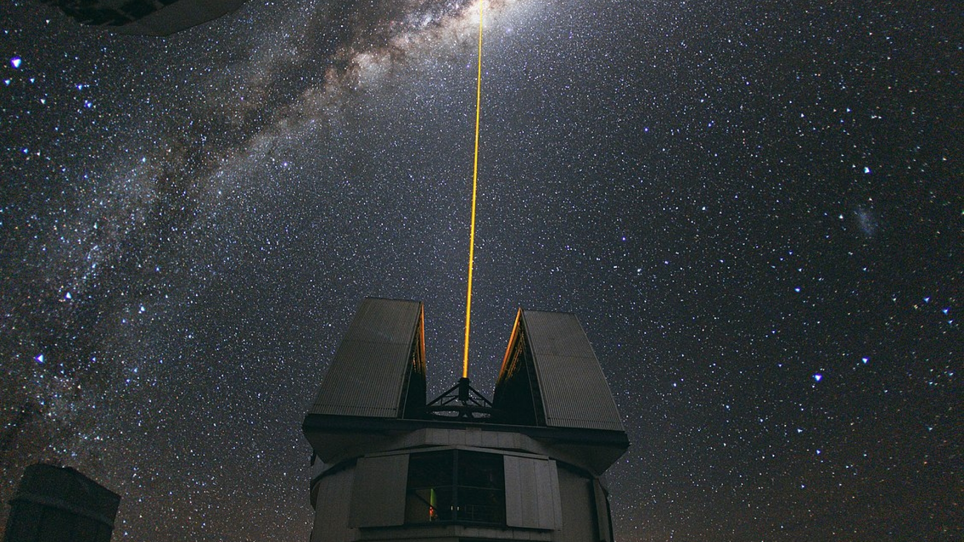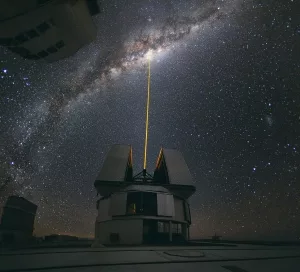 Dieser Laser am Paranal-Observatorium erzeugt einen Lichtpunkt in der oberen Atmosphäre, der als künstlicher Leitstern dient.