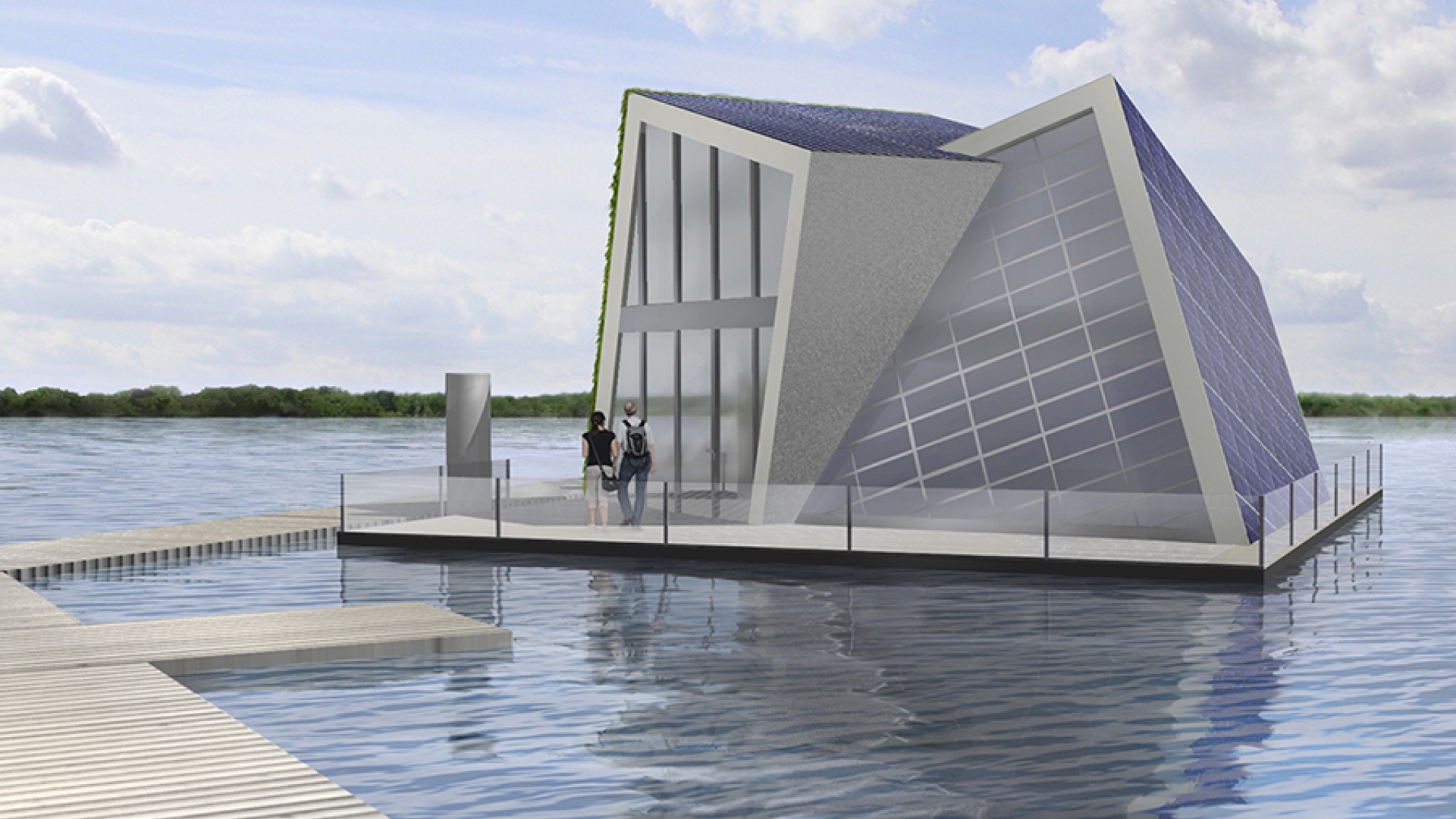 Einen Entwurf gibt es schon – und der ist alles andere als mickrig: Das Haus auf dem 13 mal 13 Meter großen Stahlponton erstreckt sich über zwei Ebenen: Das Erdgeschoss umfasst 75 Quadratmeter Wohnfläche, das Obergeschoss weitere 34 Quadratmeter. Auf der 15 Quadratmeter großen Terrasse überblickt man den gesamten See. Für angenehme Temperaturen im Sommer sorgt eine begrünte Seitenfläche des Hauses: Die in diesem Minigewächshaus entstehende Verdunstungskälte kühlt die Gebäudehülle.