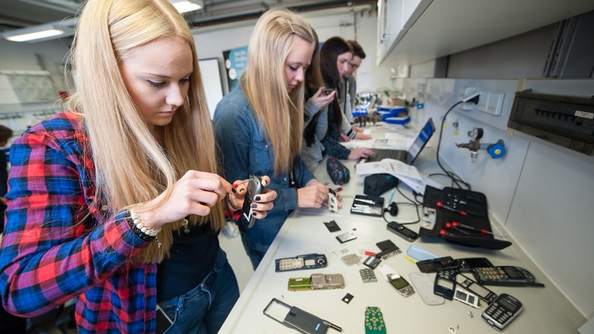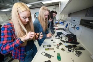 Mit Schraubenzieher und Heißluftfön dürfen die Schüler im Labor ausgemusterte Handys in ihre Grundbausteine zerlegen. Sie lernen dabei, die einzelnen Bauteile zu benennen und können sich auch darin üben, das Gerät wieder zusammenzubauen. Um Details herauszufinden, nutzen sie Mikroskope, Magnete und Röntgenstrahlen. Dabei erfahren sie mehr über die Eigenschaften von Metallen, Kunststoffen und seltenen Erden und verstehen, warum das Handyrecycling so aufwändig ist.