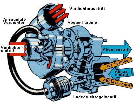Abgase treiben die Turbine an, die angesaugte Luft wird im Kompressor verdichtet.
