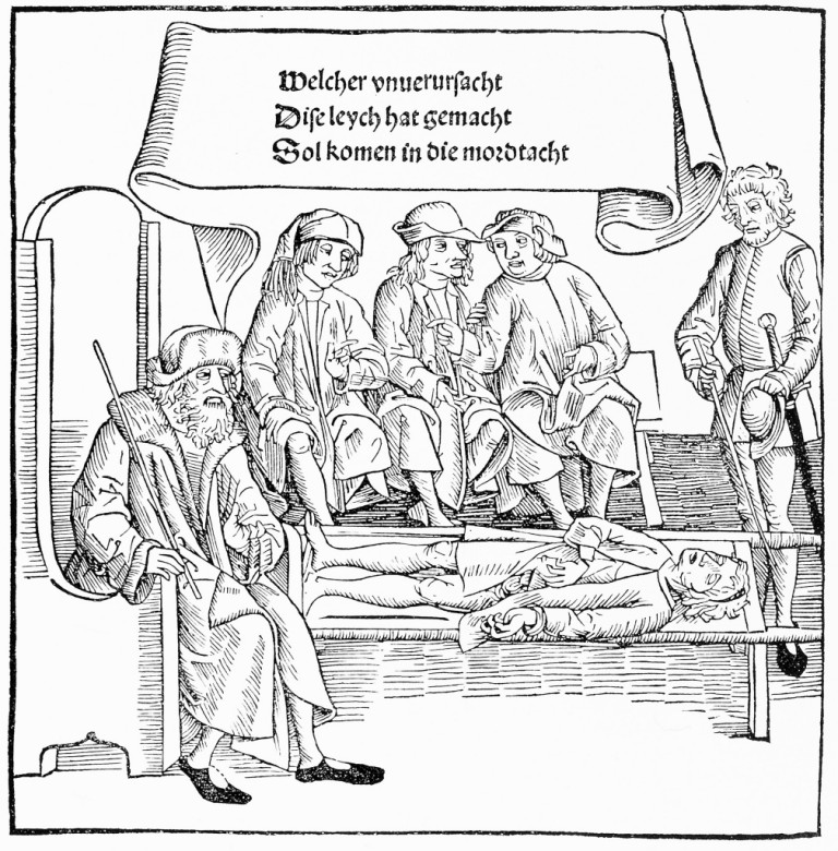 Der Richter und die Schöffen, an der Bahre eines Erschlagenen sitzend, verhängen die (Mord-)Acht über den flüchtigen Täter. Holzschnitt aus der Bambergischen Halsgerichtsordnung von 1507.