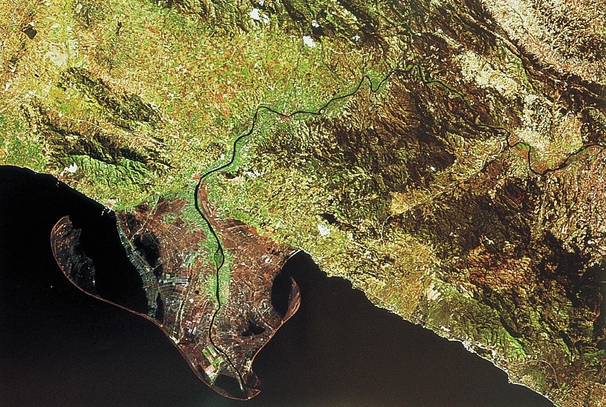 Landsat-4-Bild der Po-Mündung in die Adria. Die Mündung verschiebt sich pro Jahr 70 Meter ins Meer hinaus.