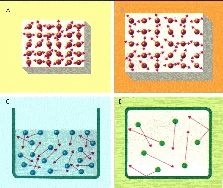 A: Die Atome eines Feststoffes führen aufgrund ihrer Bewegungsenergie ständig kleine Schwingungen um ihre Orte im Kristallgitter aus, entfernen sich jedoch nicht ganz von diesen Orten. B: Erhitzt man den Stoff, so nehmen die Schwingungen zu und verursachen eine Volumenvergrößerung. C: In einer Flüssigkeit bewegen die Atome sich frei. Auf sie wirken nur noch zwei Kräfte ein. D: In Gasen bewegen sich die Atome äußerst rasch, ihre Zusammenstöße mit den Gefäßwänden verursachen einen bestimmten Gasdruck. Im Gegensatz zu Flüssigkeiten füllen Gase jeden angebotenen Raum gleichmäßig aus.