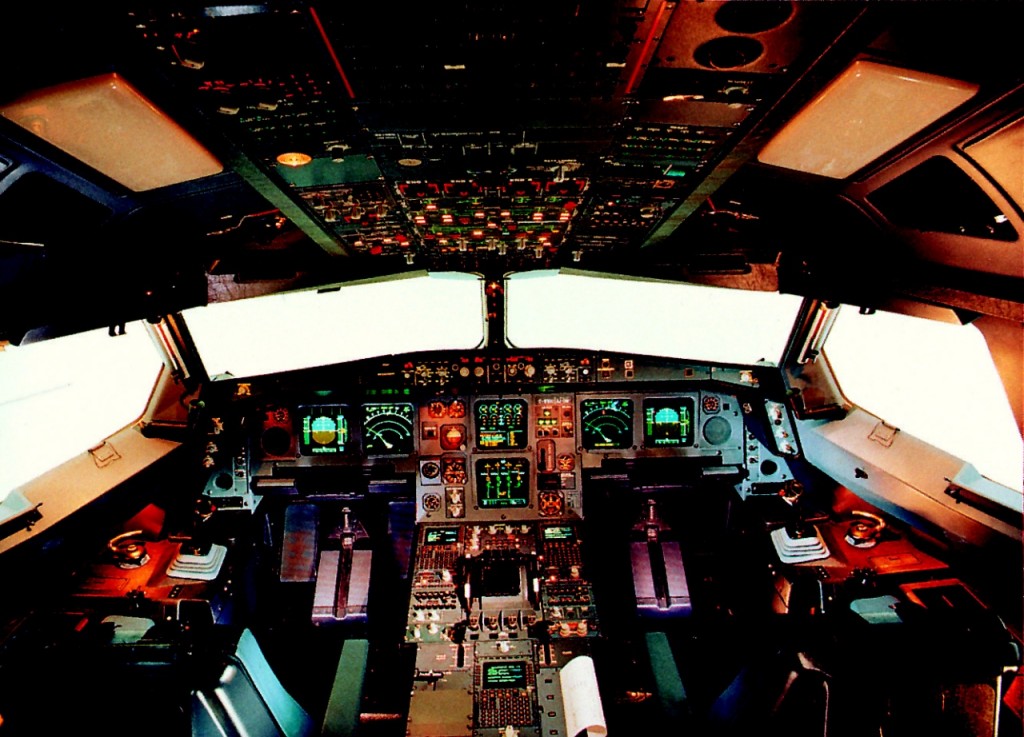 Das Cockpit eines Airbus A340 mit volldigitaler Avionik.