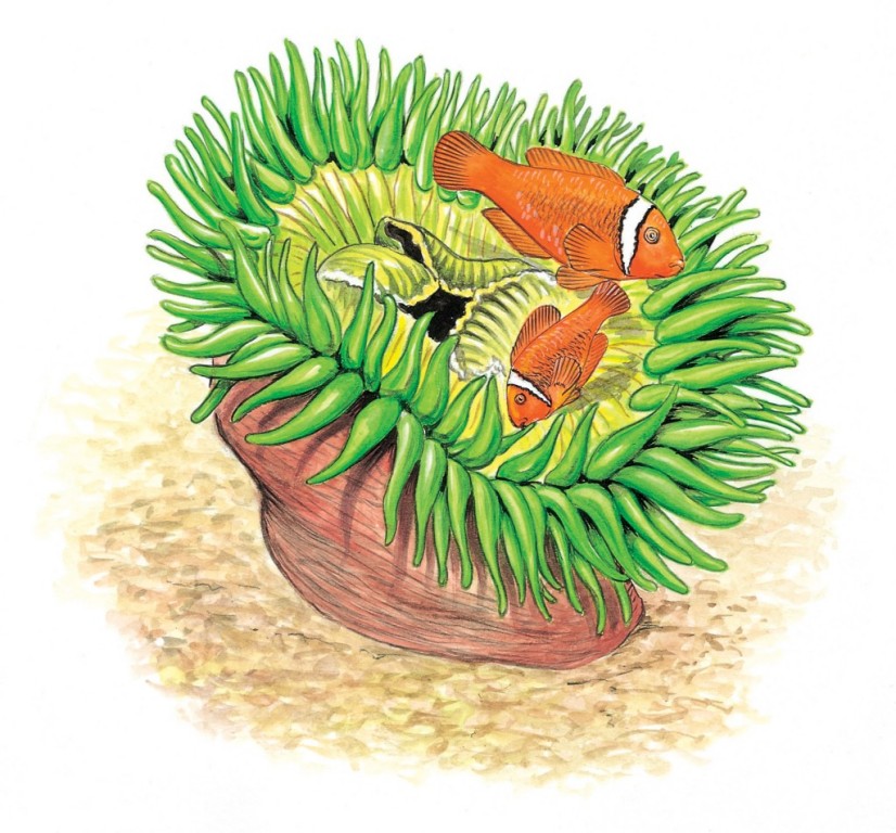 Viele Einsiedlerkrebse schleppen auf ihren Gehäusen sonderbare Aufbauten mit sich herum. Bei genauerem Hinsehen erkennt man, dass es sich hierbei um Seeanemonen handelt. Dies sind jedoch keine Meeresblumen, wie der Name vorgaukeln könnte, sondern festsitzende, nicht zu eigenständiger Bewegung fähige Blumentiere (Aktinien), deren so anmutig sich im Wasser wiegende Tentakelkränze dicht mit mörderischen Nesselkapseln bewehrt sind, die kleinere Beutetiere lähmen können. Aber auch Angreifer werden vom Gift der Nesselkapseln abgewehrt - und hierin liegt der Sinn dieser merkwürdigen Lebensgemeinschaft, zumindest aus der Sicht des Einsiedlerkrebses: Er ist durch die Nesselwirkung seiner Seeanemone bestens vor Feinden geschützt.