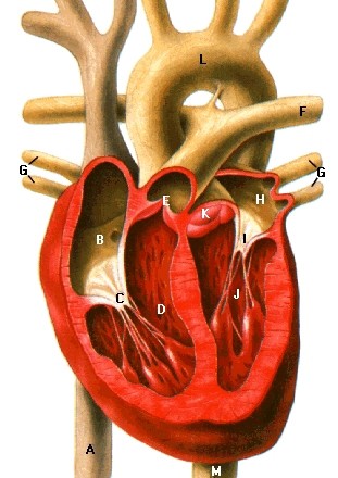 Verbrauchtes Blut fließt über die Hohlvenen (A) in den rechten Vorhof (B), von dem aus es durch die Trikuspidalklappe (C) in die rechte Kammer (D) gestoßen wird. Von dort wird es durch die Pulmonalklappe (E) in die Lungenarterien (F) und in die Lunge gepresst. Angereichert mit Sauerstoff, fließt das Blut über die Lungenvenen (G) in den linken Vorhof (H) und gelangt durch die Mitralklappe (I) in die linke Kammer (J). Diese pumpt das Blut durch die Aortenklappe (K) in den Aortenbogen (L) und in die Aorta (M), die es an die Körperschlagadern weiterleitet.