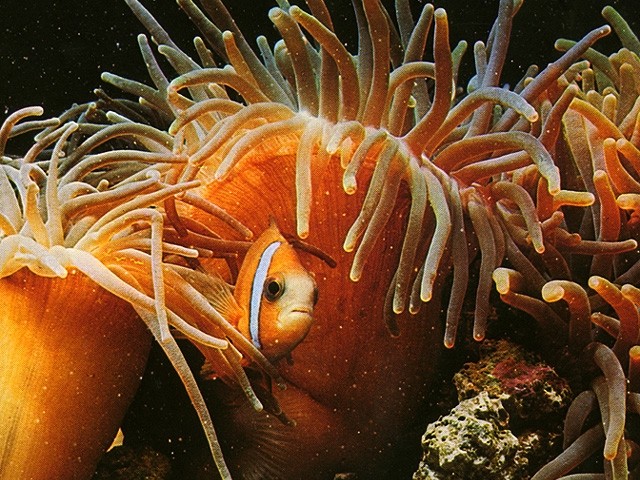 So wunderschön die zu den Blumentieren gehörenden farbenprächtigen Seeanemonen (Aktinien) auch aussehen, werden ihre mit Nesselkapseln bestückten Fangarme doch vielen kleineren Fischen gefährlich, die - wenn sie den schwebenden Tentakeln zu nahe kommen - zunächst durch das Nesselgift gelähmt und dann als Beute von der Seeanemone gefressen werden. Nicht so die Anemonenfische. Sie nehmen sogar ihre Wohnung zwischen den Fangarmen und schlafen hier, ohne von dem Nesselgift behelligt zu werden. Vielmehr genießen sie auf diese Weise den Schutz der nesselnden Fangarme und sind so vor Raubfischen sicher.