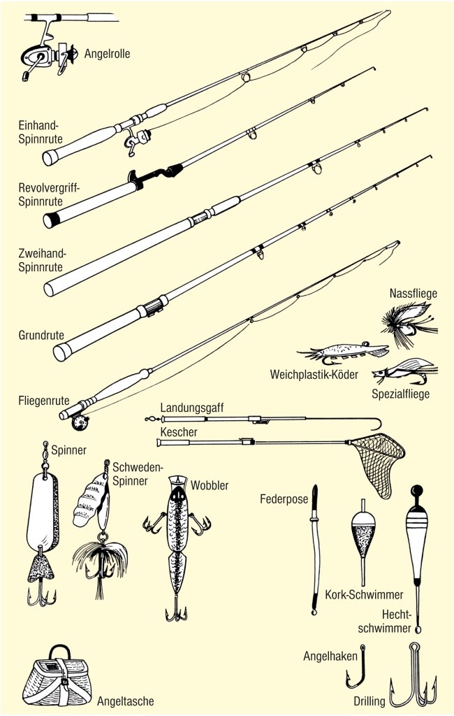 für die Angelfischerei hergestellte Gerätschaften wie Angelruten (Angelstöcke), Angelschnüre, Angelhaken und Kunstköder.