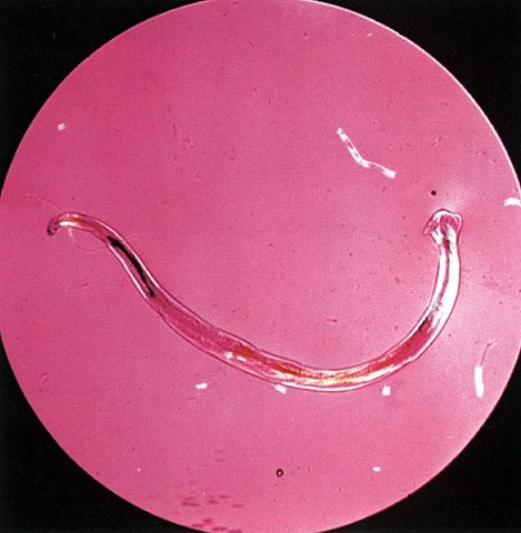 "Der Hakenwurm Ancylostoma ist in warmen Ländern zu Hause. Seine Larven dringen durch die Haut in den menschlichen Körper ein; ihr Befall verursacht erhebliche Gesundheitsstörungen."