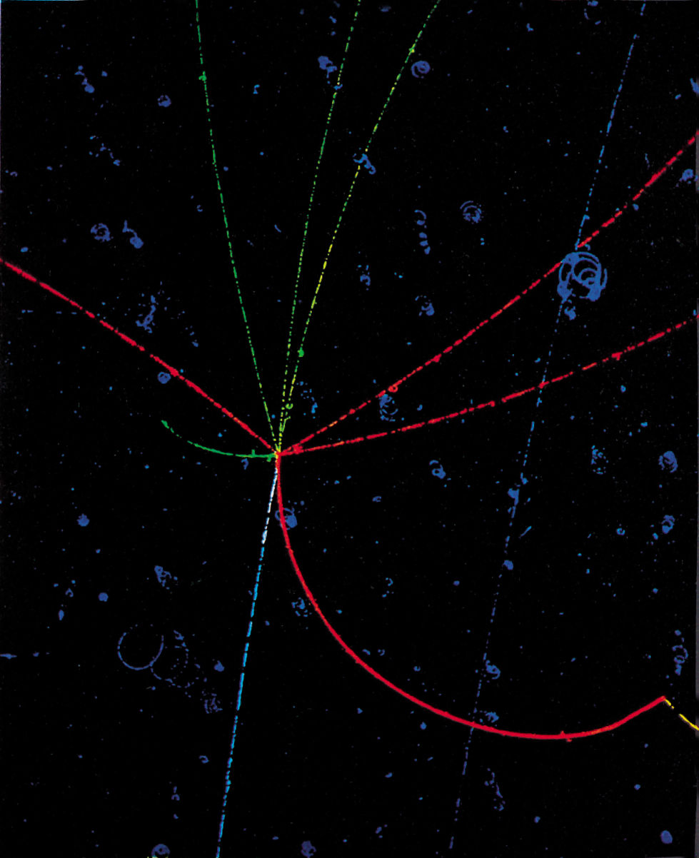 Antimaterie: Blasenkammeraufnahme der Kollision eines Antiprotons (hellblaue Spur) mit einem Proton (ohne Spur). Die bei der Vernichtung freigesetzte Energie materialisiert in vier positive (rot) und vier negative Pionen (grün).