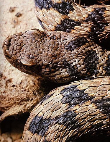 Rücken und Seiten der Schlangen sind stets von vielen, dachziegelartig übereinander liegenden Schuppen bedeckt. Auf der Bauchseite befinden sich dagegen breite Schilder. Die Form der Kopfschilder ist wie bei dieser Aspisviper (Vipera aspis) ein gutes Artkennzeichen.