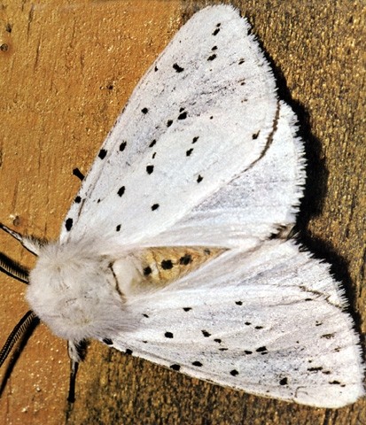 Schneeweiße, mit schwarzen Punkten gezierte Flügel weist Spilosoma menthastri auf, ein Bärenspinner, der grasiges Gelände bevorzugt, aber auch in Gärten anzutreffen ist.