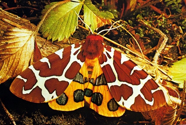 Bei Beunruhigung lässt der Braune Bär - ein Vertreter der Bärenspinner - seine warnfarbigen Hinterflügel sehen. Die Vorderflügel sind nur scheinbar auffällig gefärbt, ihr künstliches Licht-Schatten-Muster lässt das Tier meist völlig in seiner Umgebung verschwinden.