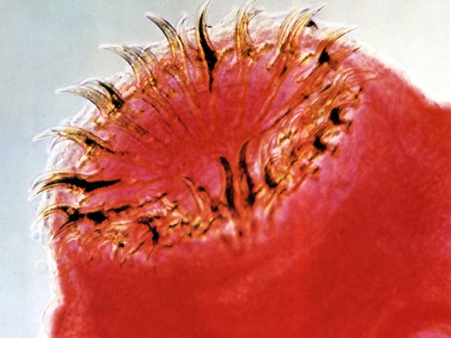 Jedes »Segment« (Proglottis) dieses Rinderbandwurmes enthält einen vollständigen männlichen und weiblichen Geschlechtsapparat. Der Kopf (Scolex) des Bandwurmes befindet sich in der Mitte der Abbildung.