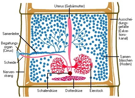 Es entwickeln sich zunächst die männlichen Geschlechtsorgane. Reifere Glieder sind fast vollständig mit einem verzweigten Uterus ausgefüllt, in dem sich die befruchteten Eier befinden.