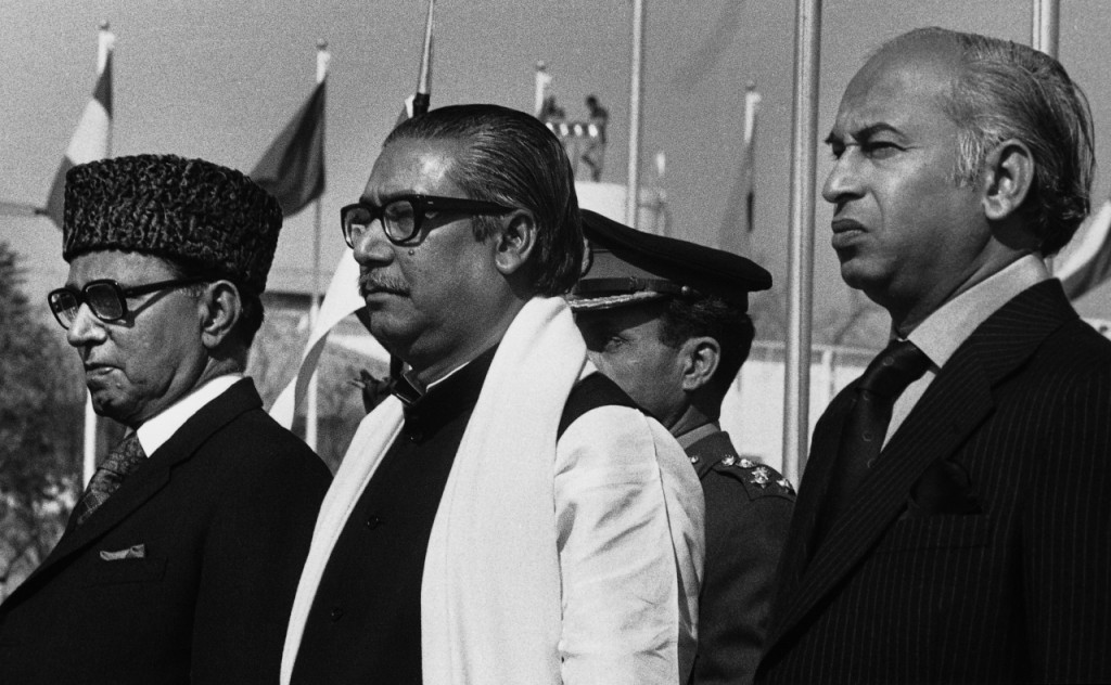 Der Ministerpräsident von Bangladesh Mudschib ur-Rahman (Mitte) und der pakistanische Premierminister Zulfikar Ali Khan Bhutto (rechts) besuchen 1974 die Islamische Gemeinschaftskonferenz, die sich mit der Krise des Mittleren Ostens beschäftigt.