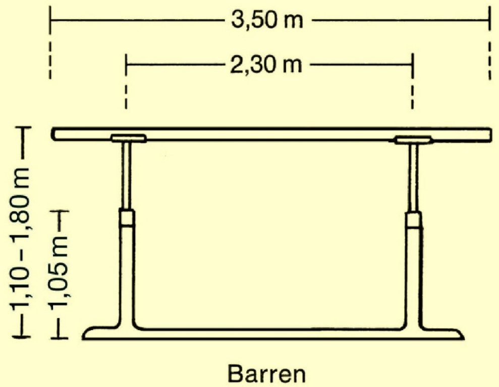 von F. L. Jahn eingeführtes Turngerät mit zwei parallelen, ca. 3,5 m langen, in Höhe (1,20–1,80 m) und Abstand (42–48 cm) verstellbaren Holmen aus Holz oder Glasfiber mit eingearbeitetem Stahl- oder Kunststoffkern. Beim Männerturnen wird der Barren als Parallelbarren (gleichhohe Holme), beim Frauen- und Kinderturnen vor allem als Stufenbarren benutzt.