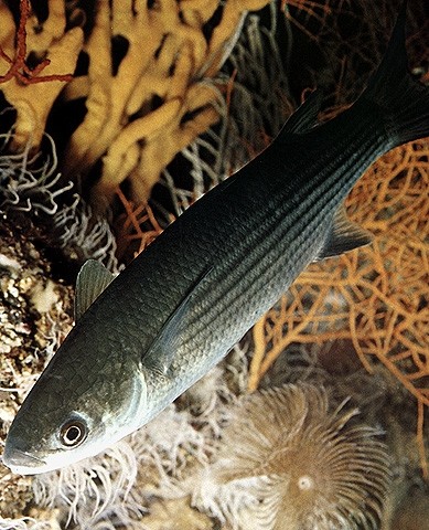 Die Gestreifte Meeräsche (Mugil cephalus) ist an ihren dunklen Längsstreifen leicht zu erkennen.