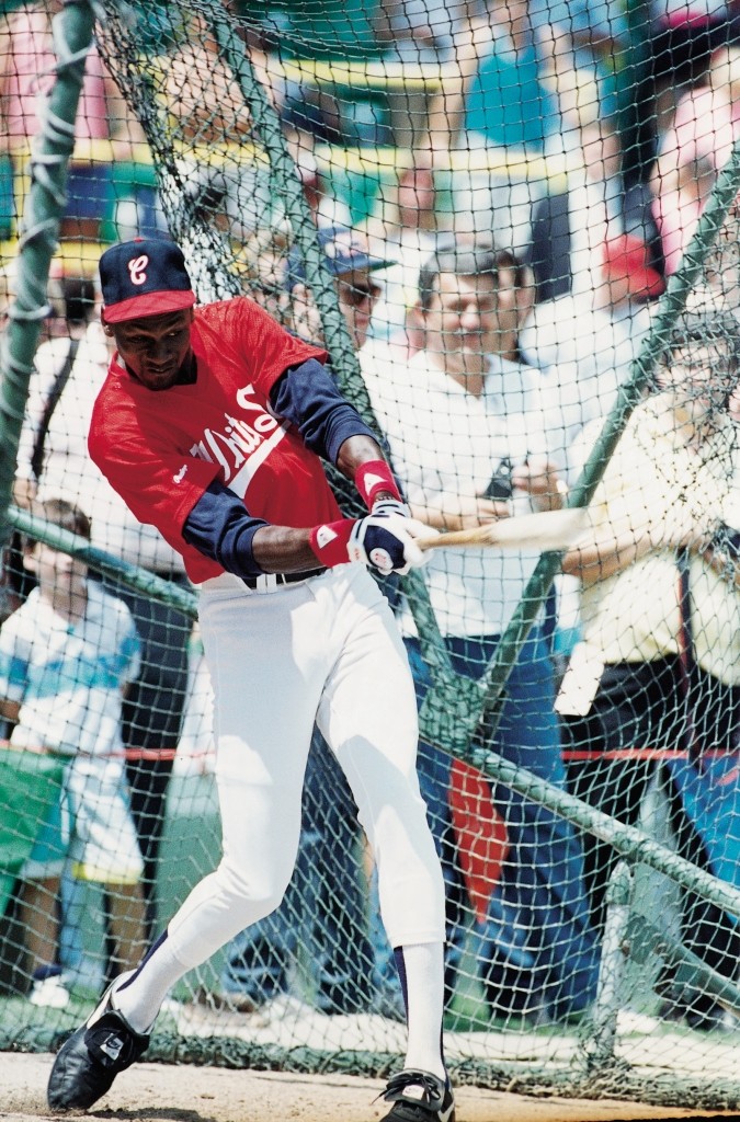 Im Comiskey Park Stadion macht der Star der Chicago Bulls, Michael Jordan, einen Abschlag beim Baseball.