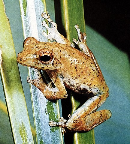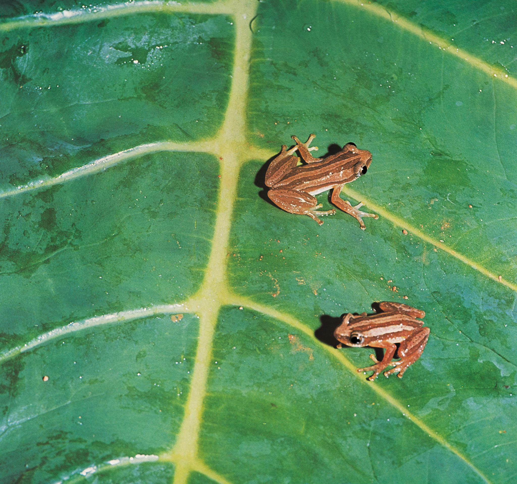 Der im westlichen Mittelafrika beheimatete Baumfrosch (Afrixalus fulvovittatus) ist wie viele Froschlurche fast nur nachts rege. Zum Anheften an Stängel und Blätter dienen diesen zierlichen Fröschen zu Haftscheiben umgebildete Zehenspitzen.