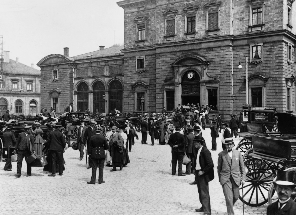 Historische Aufnahme eines Gebäudes in Bayreuth, vor dem sich die Besucher der Bayreuther Festspiele versammeln. Die Musikfestspiele wurden durch den Komponisten Richard Wagner 1872 selbst ins Leben gerufen und finden seit 1876 alljährlich (mit Unterbrechung) statt.