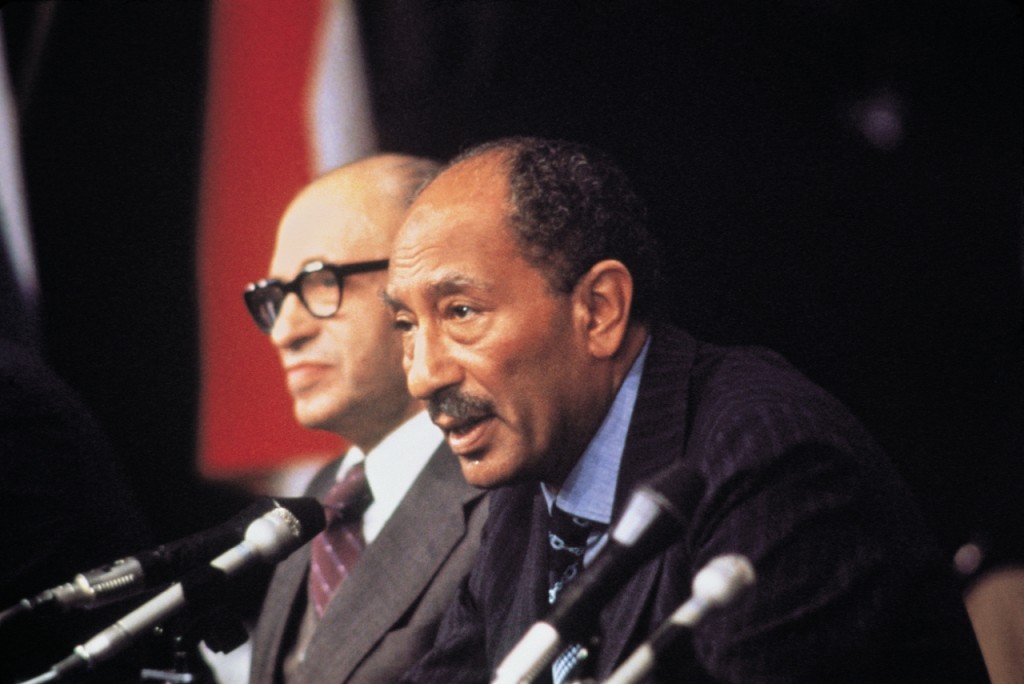 Der ägyptische Staatspräsident Anwar As Sadat (im Vordergrund) mit dem israelischen Premierminister Menachem Begin 1977 in Jerusalem.