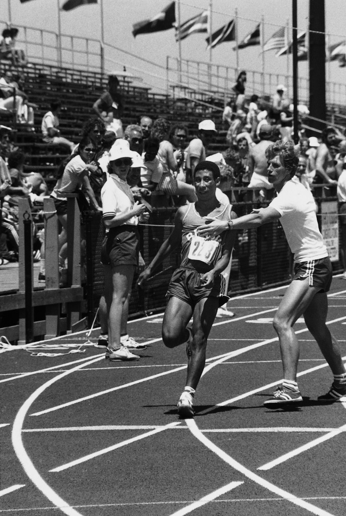 Der blinde 100-m Läufer Fernando Lauriano bei den Internationalen Spielen für Behindertensport 1984 in New York