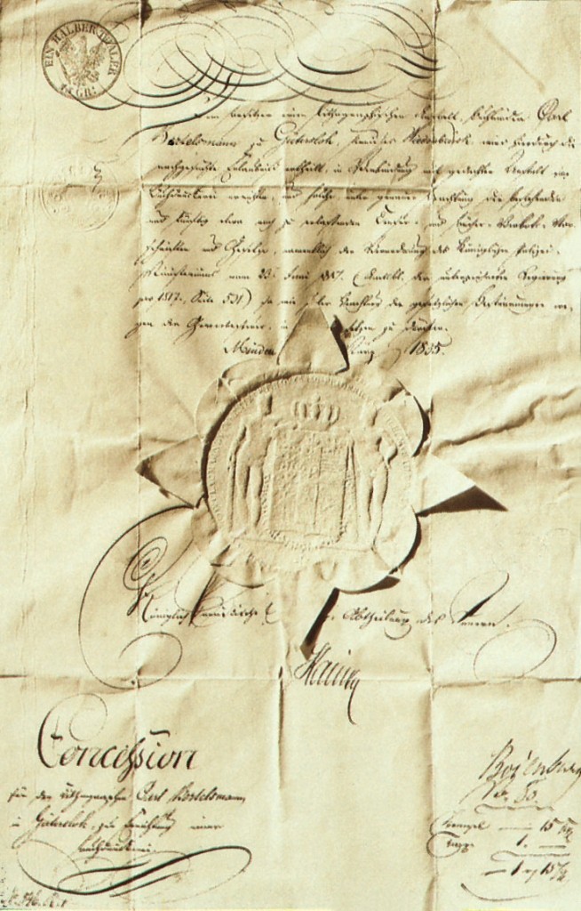Konzession zur Errichtung einer Buchdruckerei, von der königlich preußischen (Bezirks-)Regierung zu Minden am 18. März 1835 an Carl Bertelsmann erteilt. Das Dokument gilt als »Geburtsurkunde« des heutigen Unternehmens.