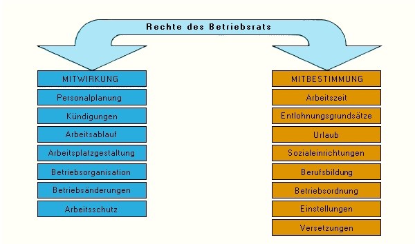 Das Amt des Betriebsrats ist ein Ehrenamt, für das keine Vergütung gewährt werden darf, doch ist Freistellung von der Arbeit zur Erfüllung der Amtsobliegenheiten zulässig. Mitglieder des Betriebsrats genießen einen besonderen Kündigungsschutz; ihnen kann nur aus einem Grund, der zur fristlosen Kündigung berechtigt, oder wegen Stilllegung des Betriebs gekündigt werden (§ 15 Kündigungsschutzgesetz). Entscheidungen des Betriebsrats werden durch Beschlussfassung herbeigeführt, deren Ausführung dem Betriebsratsvorsitzenden obliegt. Ein unmittelbares Recht, in die Betriebsleitung einzugreifen, steht dem Betriebsrat nicht zu (Betriebsverfassungsgesetz). Im öffentlichen Dienst entspricht dem Betriebsrat der Personalrat (Personalvertretung).